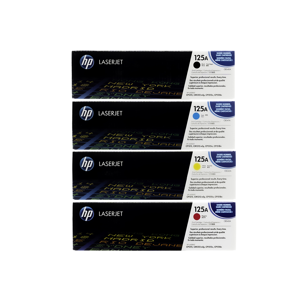 This is an Original HP 125A toner combo-pack. This set includes one Black, Cyan, Yellow and Magenta toner, and it is a collection of CB540A CB541A CB542A CB543A model numbers. HP designed these toners to work with their HP Color LaserJet CP1210, Color LaserJet CM1312 MFP, Color LaserJet CM1312nfi MFP, Color LaserJet CP1215, Color LaserJet CP1515n, Color LaserJet CP1518ni, Color LaserJet CP1515, Color LaserJet CP1518 printer models. to produce the highest quality print available. In fact, you will be able to print up to 1,400 beautiful colored pages with this set. Compare that to other manufactures where the colors are not nearly as good.