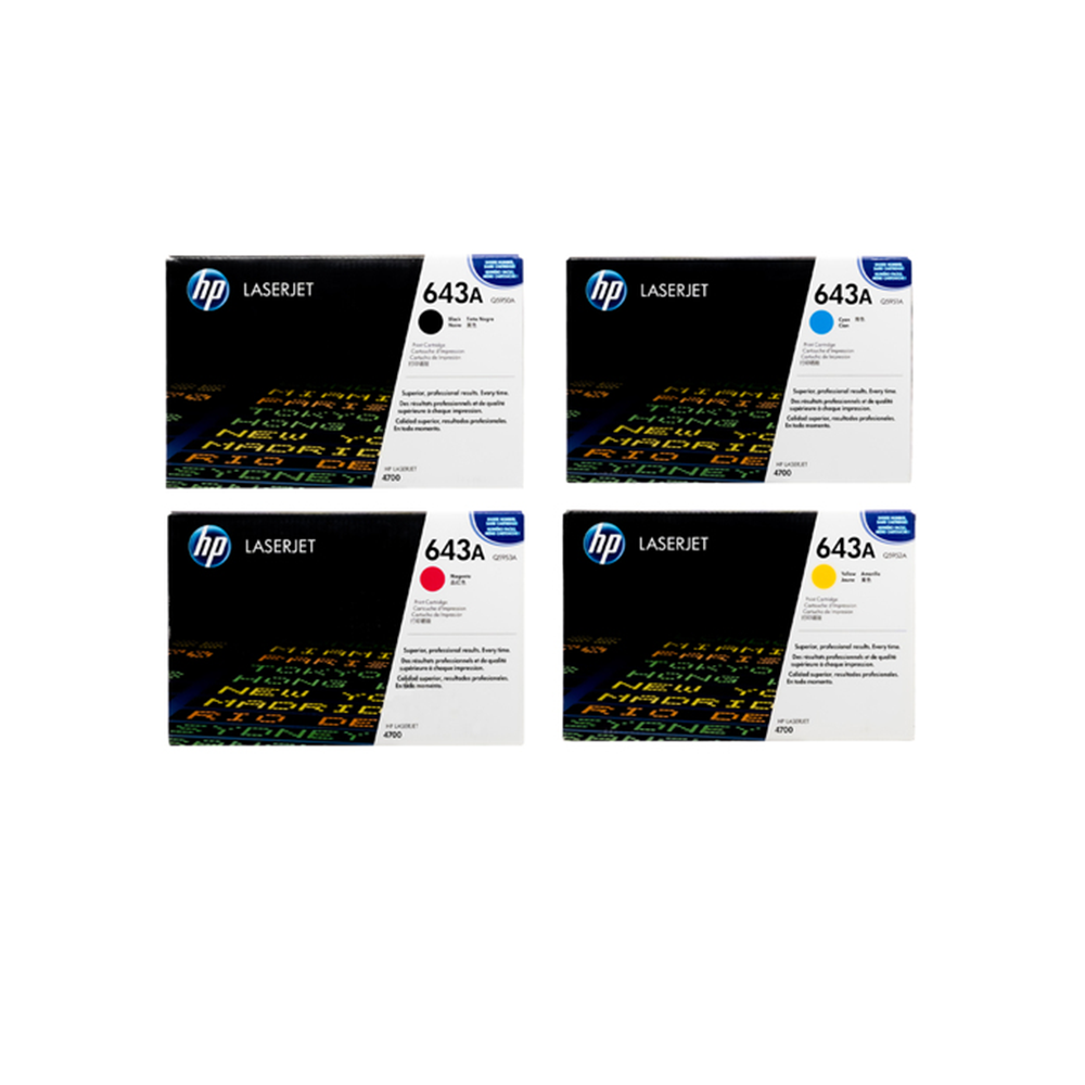 This is an Original HP 643A toner combo-pack. This set includes one Black, Cyan, Yellow and Magenta toner, and it is a collection of Q5950A Q5951A Q5952A Q5953A model numbers. HP designed these toners to work with their HP Color LaserJet 4700, Color Laserjet 4700dn, Color LaserJet 4700dtn, Color LaserJet 4700n, Color LaserJet 4700ph+ printer models. to produce the highest quality print available. In fact, you will be able to print up to 10,000 beautiful colored pages with this set. Compare that to other manufactures where the colors are not nearly as good.
